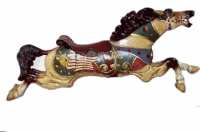 Manufacturers/Carvers: Most of the old carvers didn't sign their work. Some horses had manufacturer's marks built into the design of the animal, such as PTC for Philadelphia Toboggan Company. Some names you'll hear when learning about carousel animals are Stein and Goldstein, Philadelphia Toboggan Company, Marcus Illions, C. W. Parker, Gustav & William Dentzel, Charles Looff, Daniel C. Muller, Charles Carmel, Charles W. Dare, Herschell/Spillman and Allan Herschell. My favorites are usually Stein/Goldstein and Marcus Illions horses, who usually are big and strong, have expressive eyes, flaring nostrils and seem ready to charge! C. W. Parker horses are often recognized first by carousel novices, as they often populated the older "country fair" carousels that travel around the country at festivals and fairs. The small horse "running" at the top of this page is a beautifully restored C. W. Parker pony! Horses carved by Daniel Muller were often decorated in military gear and were astoundingly realistic.